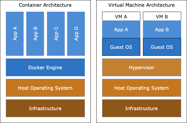 가상 머신(VM, Virtual Machine)은 Hypervisor를 이용해 하나의 HostOS에서 여러 개의 GuestOS를 설치하는 형태이다. 각각의 가상 머신이 하나의 독립된 커널 공간을 가진 컴퓨터 환경을 의미한다. 따라서, 여러 개의 가상 머신이 포함되기 때문에 용량이 무거워지게 된다.