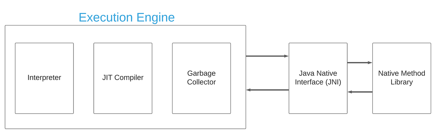실행 엔진에서 자바 바이트 코드는 가상 머신이 이해할 수 있는 컴파일 된 코드로 JVM 내부에서 기계가 바로 수행할 수 있도록 한다. Java Interpreter와 JIT Compiler를 통해 바이트 코드를 실행한다.