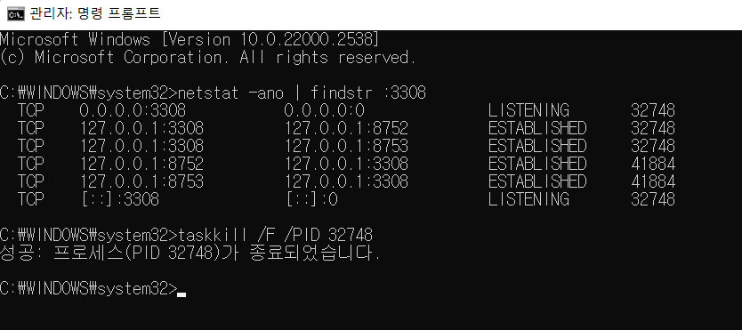 ํด๊ฒฐ๋ฐฉ๋ฒ์ ๊ด๋ฆฌ์ ์ค์ ์ผ๋ก cmd ์ฐฝ์ ์ด์ด ํด๋น ํฌํธ(3308)๋ฅผ ์ฃฝ์ฌ์ผ ํ๋ค.