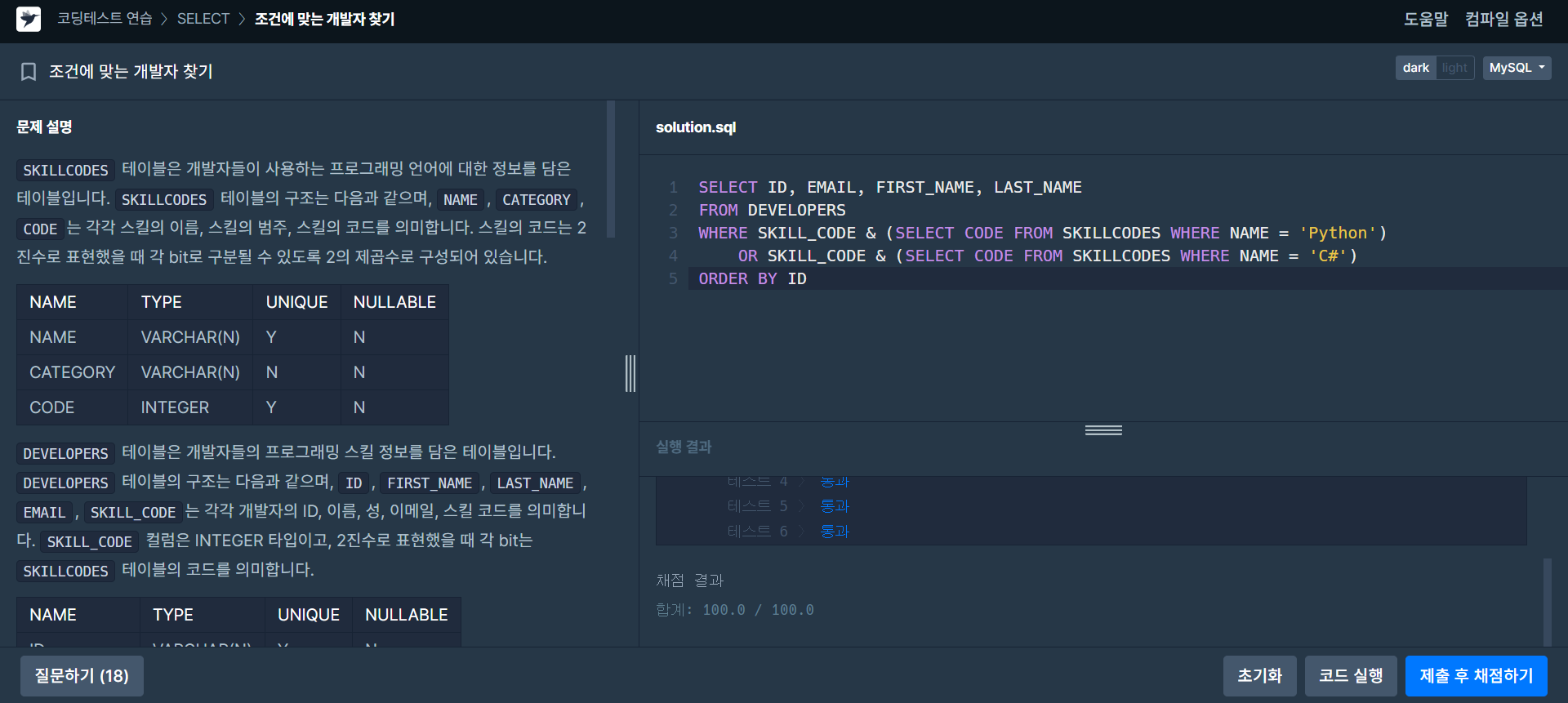 - MySQL에서 Python, C# 스킬을 가진 개발자를 찾기 위해 비트연산자인 AND 연산(&)을 사용하였다.