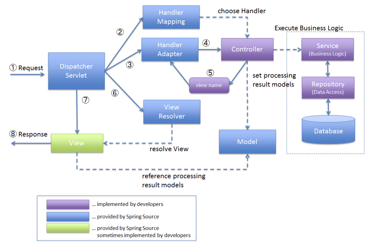 웹에 URL 주소를 입력했을 때 HTTP 요청이 시작된다. 요청을 하고 응답을 받으면 이 과정이 종료되는데, 어떤 일이 일어나는지 알아보자. 1. Client에서 Server로 요청을 전달한다. 이 요청은 DispatcherServlet이 받는데, 이것은 요청을 처리하기 위한 프론트 컨트롤러이다. 진입점 역할을 한다. DispatchServlet이 등장하게 된 배경은, 기존의 web.xml에 대한 의존을 낮추고 하나의 서블릿으로 모든 것을 관리해서 코드 중복 문제가 없어졌다. 자세한 것은 Spring MVC 패턴의 front-controller pattern을 알아보면 된다. 2. 해당 엔드포인트를 어떤 컨트롤러가 담당할지 HandlerMapping이 결정한다. (RequestMappingHandlerM..